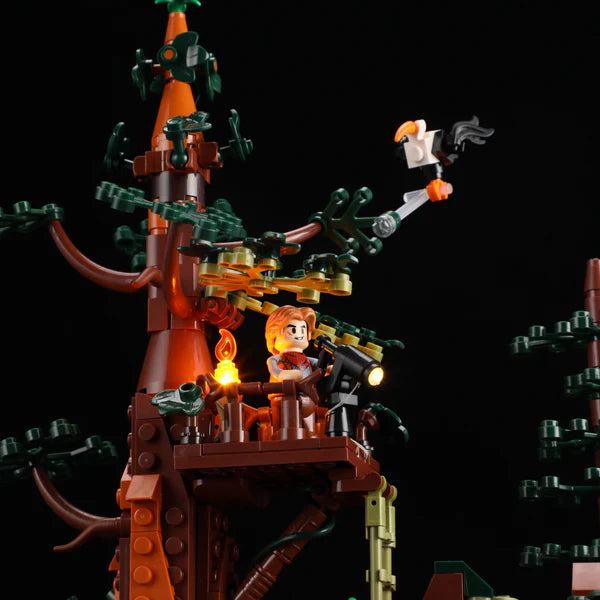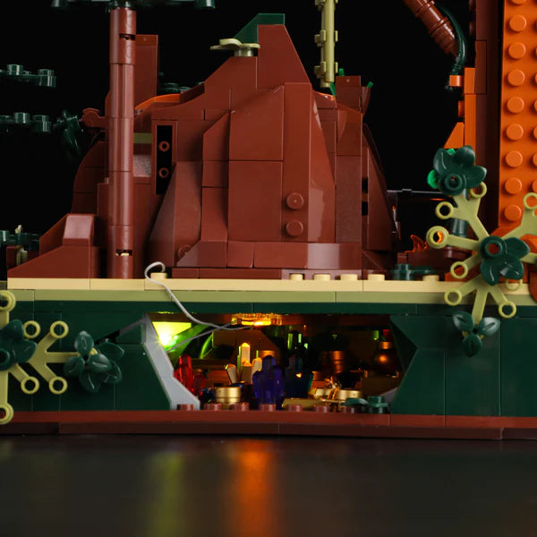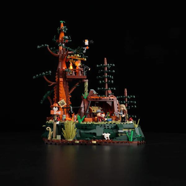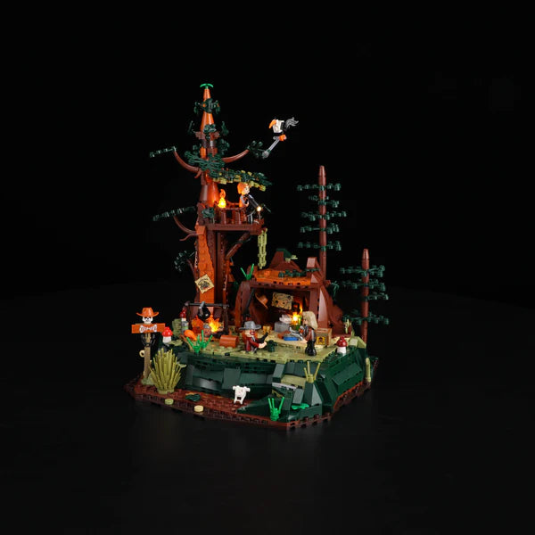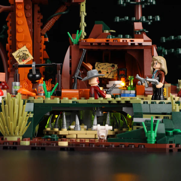 Technically, the model masterfully combines light, mechanics, and storytelling. The integrated "3D Light & Shadow" system with seven LED zones, two light bars, and floor switches brings the darkness to life – from the flickering campfire to the warmly lit huts. Three detailed bandit minifigures – two men and a woman – infuse the scene with charisma and dynamism. Gear-driven functions such as the 360° searchlight, a clever trap or treasure mechanism, and a mechanical elevator further enhance the interactive experience. A secret treasure cave is hidden beneath the wooden platform, its glittering contents visible from the side – a magical moment for explorers. The 1,183-piece build is both challenging and captivating: wiring, assembling, and connecting – an intense, focused building experience for experienced modelers.