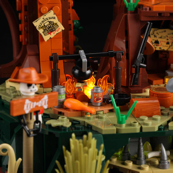 Deep forests, endless shadows, a glimmer of light between mighty trunks: The Sequoia bandit camp transports you to a Wild West moment far from the desert. Here, loot plans lie beneath rotting floorboards, a vulture keeps watch, and lanterns paint stories on bark and rock. The name "Sequoia" refers to the gigantic sequoia trees of Northern California—ancient giants that rise like wooden cathedrals into the sky. It is precisely in this rugged, awe-inspiring environment that outlaws have established their secret camp—hidden among roots and rocks, far from sheriffs and towns. The set perfectly captures this feeling: the moment between tranquility and danger, between camaraderie around the fire and the sound of a distant hoof in the mist.