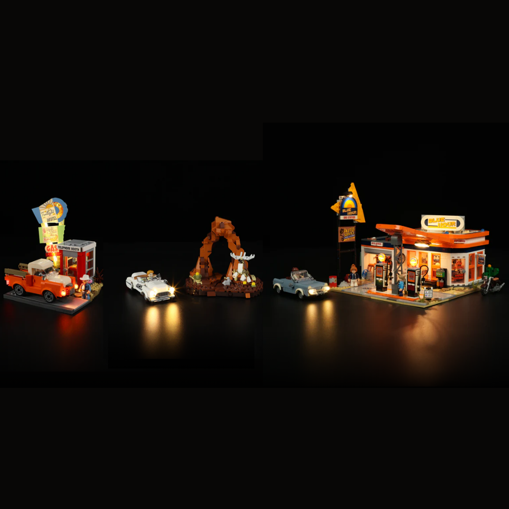 Welcome to the endless highway of longing – a journey through 1960s America, where neon lights, desert winds and the hum of engines tell the story of an entire era. The Lumibricks Road Trip Collection unites five iconic dioramas into one cohesive experience: the glowing Motel at Sunset, the bustling Retro Gas Station, the vibrant Night Glow Drive-In Theater, the nostalgic Desert Stop at Sunset and the poetic Encounter with the Deer. Together they form a cinematic tableau between asphalt and starlight – a homage to freedom, wanderlust and the golden age of American road trips. Building this collection means diving into tales of departure, night drives and quiet moments at the roadside – every light and every brick a fragment of memory from a glowing world long gone.