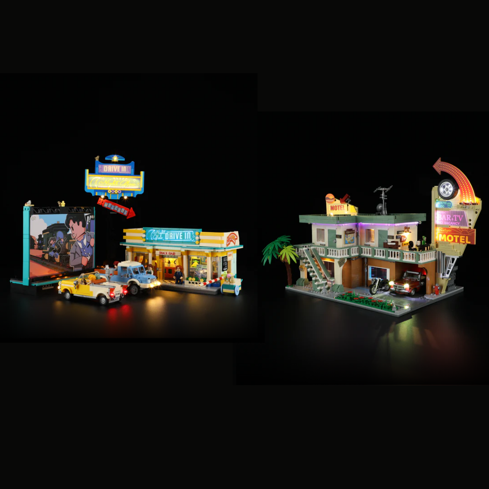 Technically and artistically, this bundle is a masterpiece of atmosphere and detail: over 6,000 pieces and more than 60 LEDs illuminate the highway, motel and drive-in in warm, cinematic light. Six beautifully designed vintage cars and two classic motorcycles capture the spirit of 1960s automotive culture – flowing lines, chrome details and a sense of motion even at rest. 16 minifigures – travelers, mechanics, moviegoers and motel guests – bring each scene to life, turning the collection into a vibrant diorama. Every set has its own mood: some quiet and meditative, others lively and colorful. Thanks to modular connections, the models flow naturally into one another, forming a continuous roadside world – from desert dusk to neon-lit city limits.