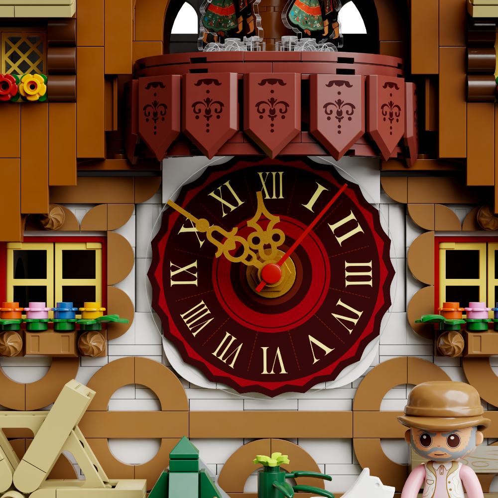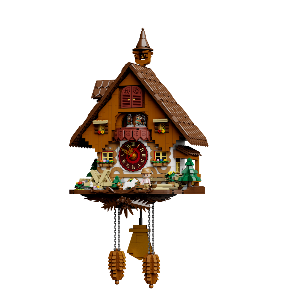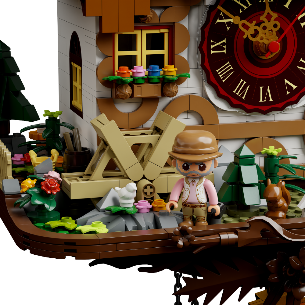 Empfohlen ab 6 Jahren, ist das Modell vor allem für erfahrene Baumeister, Nostalgiker und Sammler gedacht. Mit einer imposanten Höhe von rund 60 cm wird die Kuckucksuhr zum eindrucksvollen Displaystück, das sowohl auf dem Sideboard als auch an der Wand alle Blicke auf sich zieht. Die warmen Holz- und Naturfarben verleihen ihr eine gemütliche Ausstrahlung, die perfekt zu einem traditionellen Schwarzwald-Interieur passt. Die enthaltene Minifigur sowie das Eichhörnchen und der Vogel geben der Szene zusätzliches Leben und machen aus der Uhr nicht nur ein Dekorationsobjekt, sondern ein Stück lebendige Miniaturwelt. Ein Muss für alle, die Retro-Designs lieben und Freude an außergewöhnlicher Architektur im Klemmsteinformat haben.