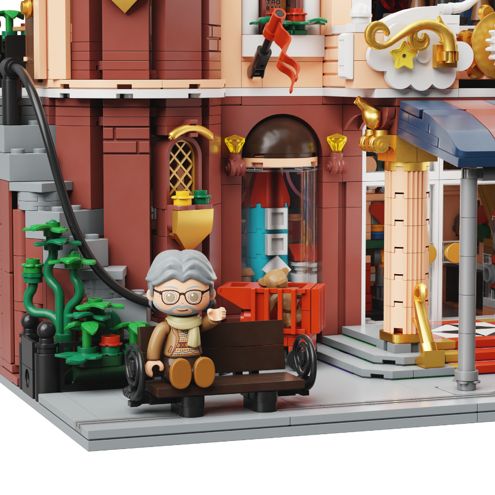 Das Set begeistert durch eine Fülle kreativer Bautechniken und kleiner Überraschungen. Über 2.850 Teile formen das modulare Gebäude, dessen Stockwerke sich abnehmen lassen, um Einblicke ins Innere zu gewinnen. Im Erdgeschoss warten winzige Miniaturen und Spielwaren, die als Anspielungen auf frühere Pantasy-Sets dienen. Im Obergeschoss lädt ein nostalgischer Arcade-Raum zum Staunen ein, während die Dachterrasse mit einer klassischen Wippe für interaktive Momente sorgt. Besonders charmant ist die bewegliche Nussknacker-Gruppe in der Fassade – ein technisches Detail, das den Bau abwechslungsreich und das fertige Modell lebendig macht. Fünf enthaltene Figuren beleben zusätzlich die Szene, sodass man das Café nicht nur als Display, sondern auch als kleine Spielwelt nutzen kann.