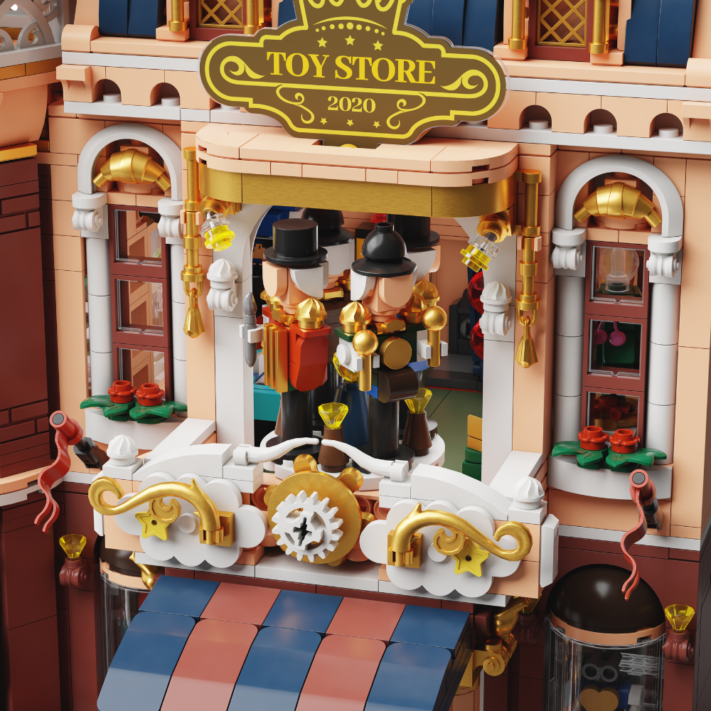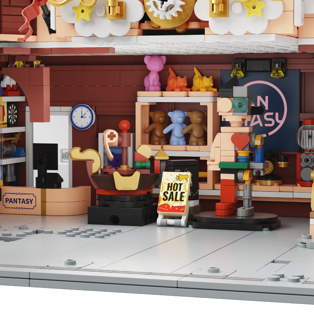 Der „Spielzeugladen“ von Pantasy vereint märchenhaften Architektur-Charme mit detailreicher Spielfreude. In einem dreistöckigen Stadthaus im europäischen Stil entfaltet sich eine nostalgische Atmosphäre, die Erinnerungen an Weihnachtsmärkte, Kinderträume und die Magie alter Spielzeuggeschäfte weckt. Die creme-rote Fassade wird von einer imposanten Nussknacker-Gruppe geschmückt, die sich über ein Zahnrad in Bewegung setzen lässt – ein Highlight, das dem Modell ein einzigartiges Schaufenster-Flair verleiht. Schon beim ersten Anblick entsteht ein Gefühl von festlicher Vorfreude und lebendigem Straßenszenario, das Jung und Alt gleichermaßen begeistert.