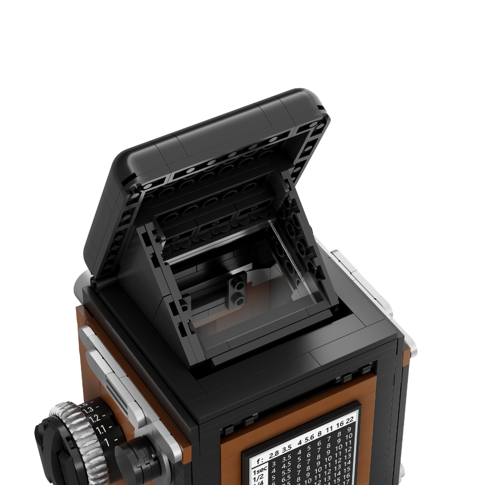 Der Aufbau überzeugt durch die gewohnt hohe Präzision der GoBricks-Steine, die eine makellose Haptik garantieren. Besonderes Augenmerk liegt auf der mechanischen Finesse: Der Lichtschachtsucher lässt sich authentisch aufklappen, während die seitliche Kurbel und die Fokus-Räder das haptische Erlebnis einer echten Kamera nachempfinden. Die glatten Oberflächen und metallischen Akzente sorgen für ein Finish, das kaum noch an einen Bausatz erinnert.